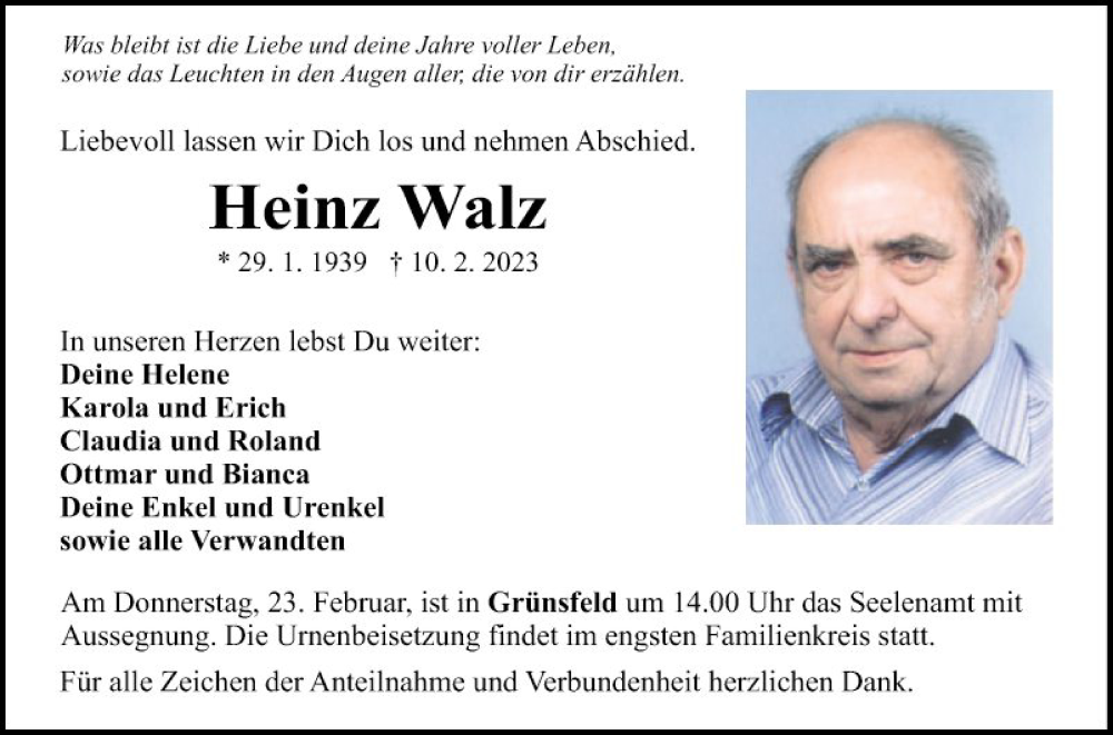 Hier finden Sie alle Traueranzeigen aus der Zeitung, die bisher für Heinz Walz erschienen sind. Weitere Traueranzeigen, die in der Zeitung erscheinen, werden hier ebenfalls aufgelistet
