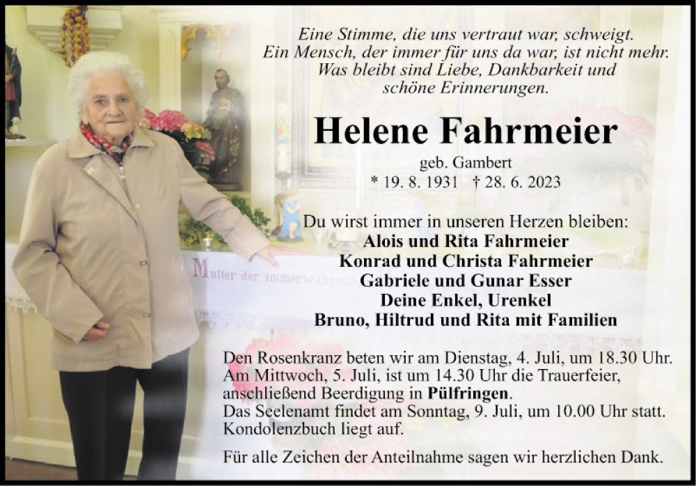 Hier finden Sie alle Traueranzeigen aus der Zeitung, die bisher für Helene Fahrmeier erschienen sind. Weitere Traueranzeigen, die in der Zeitung erscheinen, werden hier ebenfalls aufgelistet