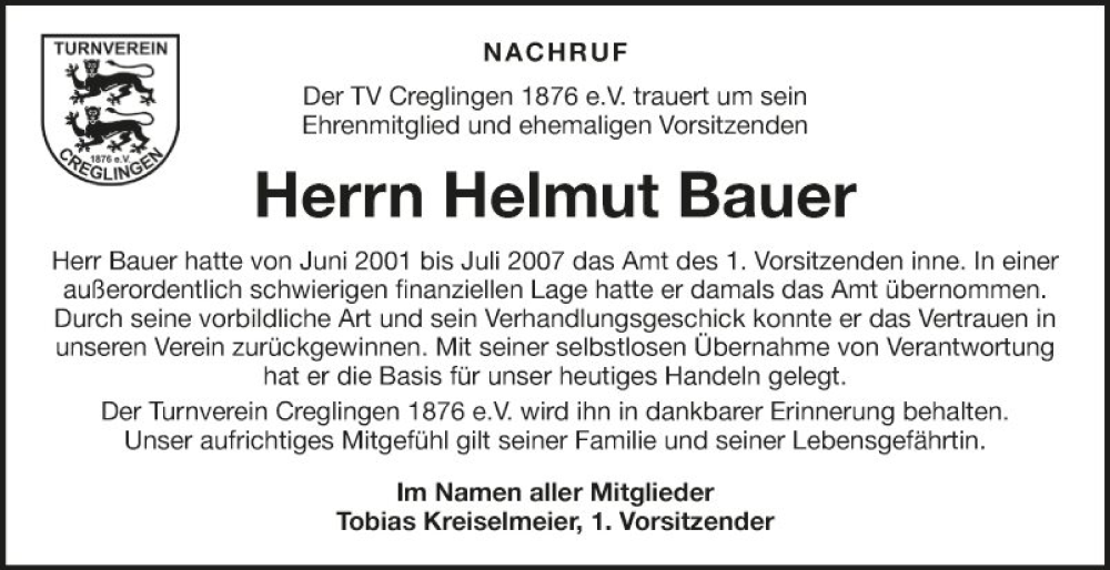 Hier finden Sie alle Traueranzeigen aus der Zeitung, die bisher für Helmut Bauer erschienen sind. Weitere Traueranzeigen, die in der Zeitung erscheinen, werden hier ebenfalls aufgelistet