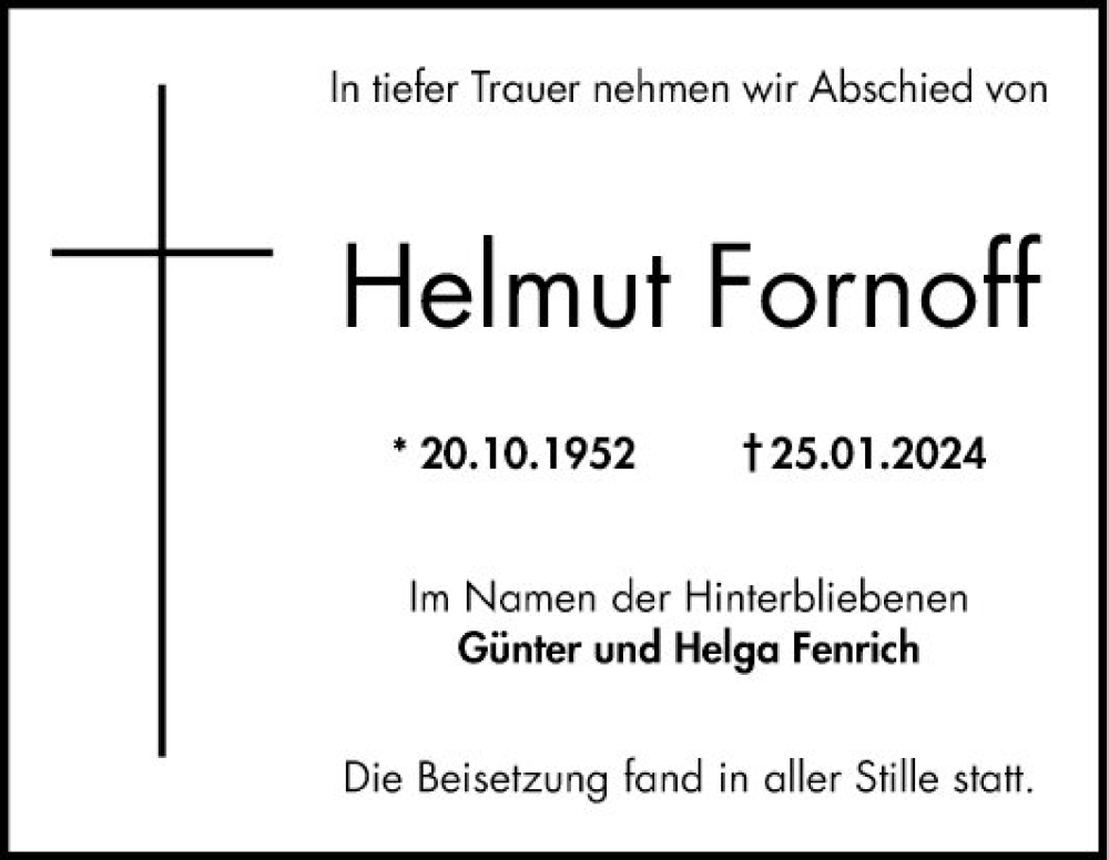 Hier finden Sie alle Traueranzeigen aus der Zeitung, die bisher für Helmut Fornoff erschienen sind. Weitere Traueranzeigen, die in der Zeitung erscheinen, werden hier ebenfalls aufgelistet