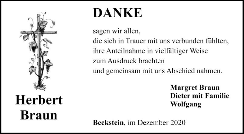 Hier finden Sie alle Traueranzeigen aus der Zeitung, die bisher für Herbert Braun erschienen sind. Weitere Traueranzeigen, die in der Zeitung erscheinen, werden hier ebenfalls aufgelistet
