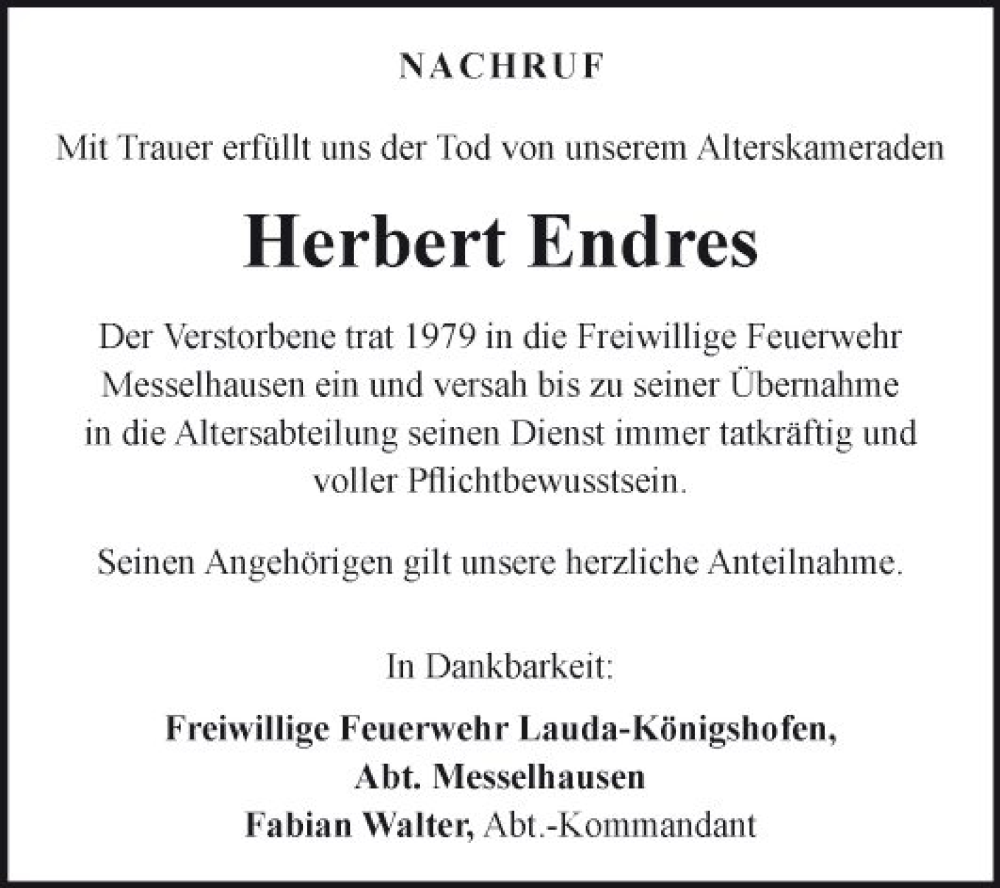Hier finden Sie alle Traueranzeigen aus der Zeitung, die bisher für Herbert Endres erschienen sind. Weitere Traueranzeigen, die in der Zeitung erscheinen, werden hier ebenfalls aufgelistet