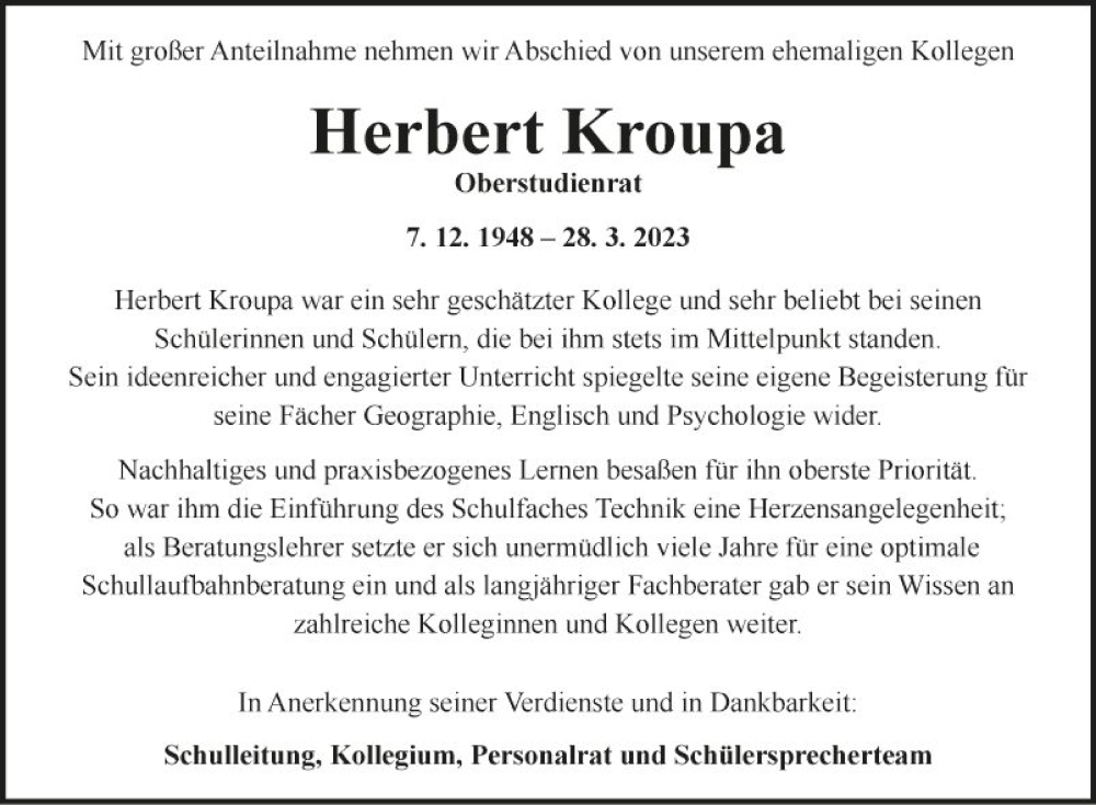 Hier finden Sie alle Traueranzeigen aus der Zeitung, die bisher für Herbert Kroupa erschienen sind. Weitere Traueranzeigen, die in der Zeitung erscheinen, werden hier ebenfalls aufgelistet