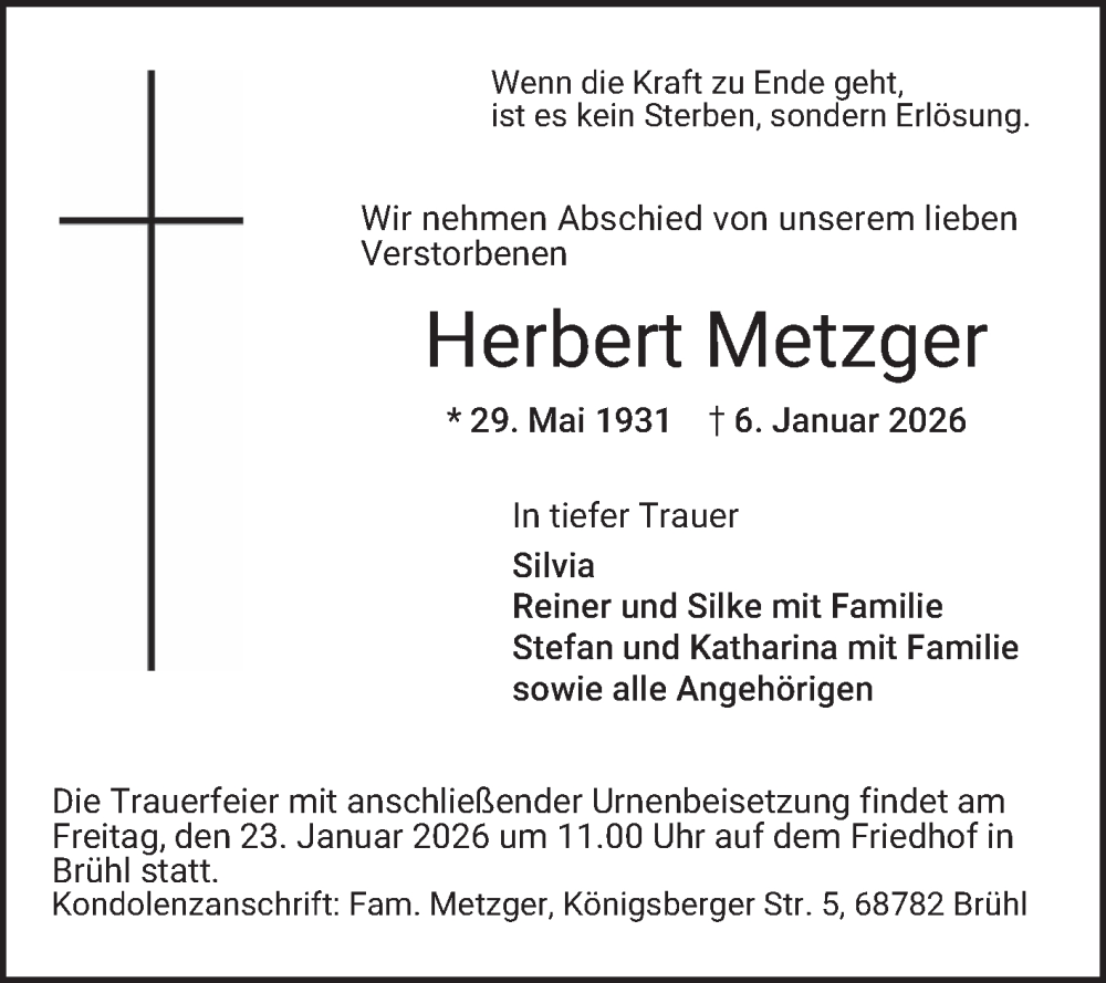 Hier finden Sie alle Traueranzeigen aus der Zeitung, die bisher für Herbert Metzger erschienen sind. Weitere Traueranzeigen, die in der Zeitung erscheinen, werden hier ebenfalls aufgelistet