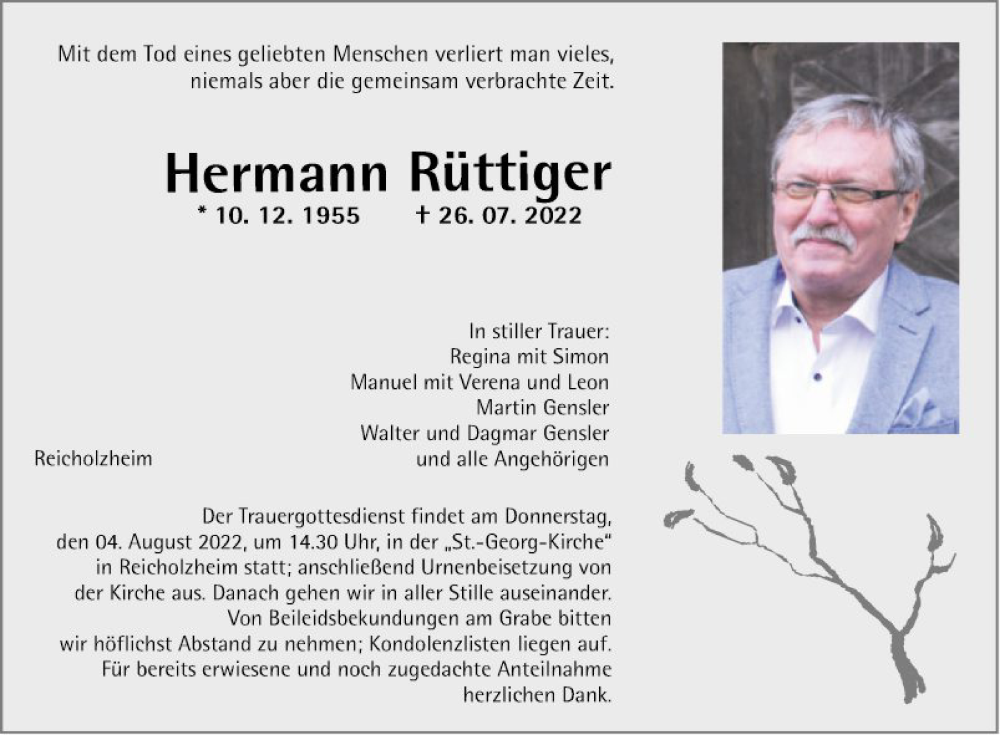 Hier finden Sie alle Traueranzeigen aus der Zeitung, die bisher für Hermann Rüttiger erschienen sind. Weitere Traueranzeigen, die in der Zeitung erscheinen, werden hier ebenfalls aufgelistet