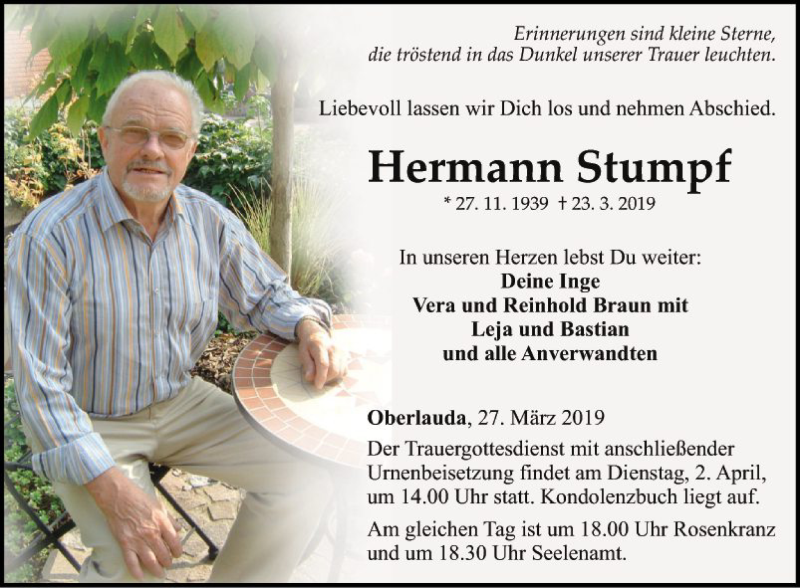 Hier finden Sie alle Traueranzeigen aus der Zeitung, die bisher für Hermann Stumpf erschienen sind. Weitere Traueranzeigen, die in der Zeitung erscheinen, werden hier ebenfalls aufgelistet