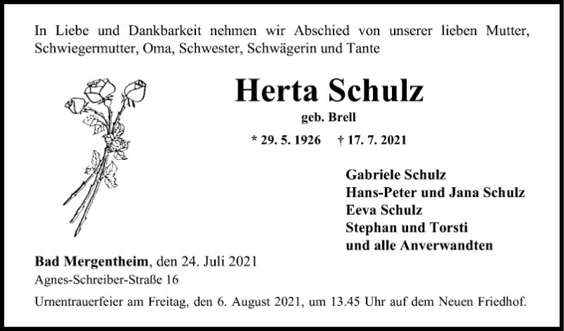 Hier finden Sie alle Traueranzeigen aus der Zeitung, die bisher für Herta Schulz erschienen sind. Weitere Traueranzeigen, die in der Zeitung erscheinen, werden hier ebenfalls aufgelistet