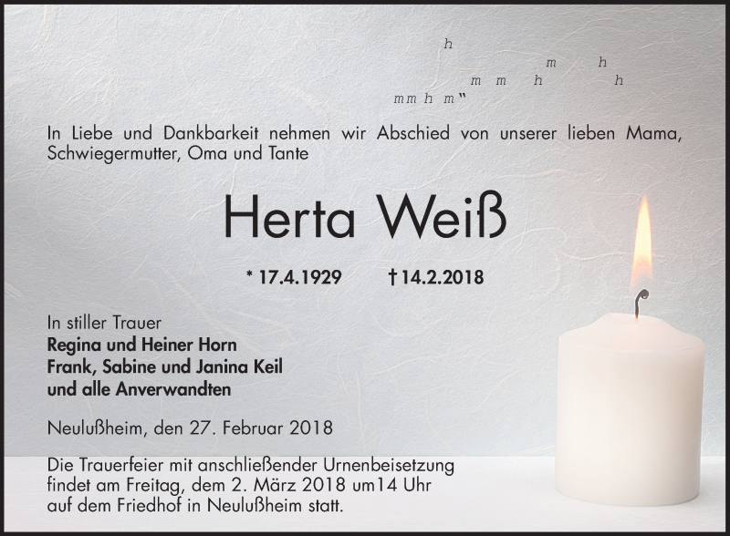 Hier finden Sie alle Traueranzeigen aus der Zeitung, die bisher für Herta Weiß erschienen sind. Weitere Traueranzeigen, die in der Zeitung erscheinen, werden hier ebenfalls aufgelistet