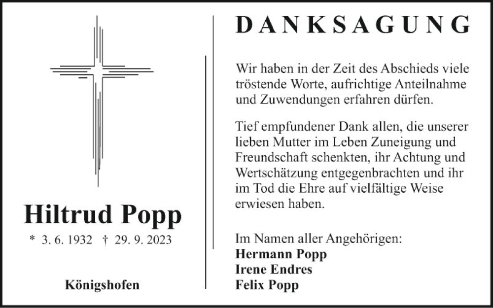 Hier finden Sie alle Traueranzeigen aus der Zeitung, die bisher für Hiltrud Popp erschienen sind. Weitere Traueranzeigen, die in der Zeitung erscheinen, werden hier ebenfalls aufgelistet