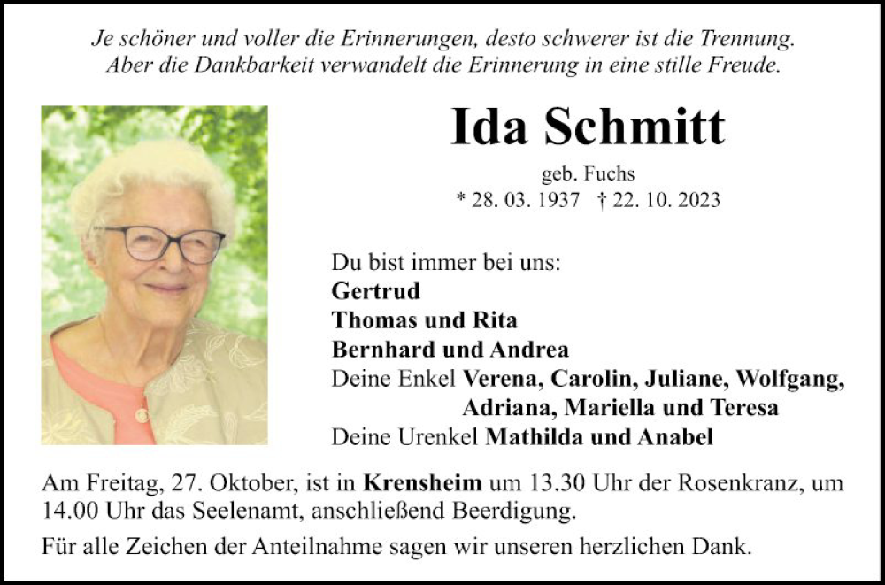Hier finden Sie alle Traueranzeigen aus der Zeitung, die bisher für Ida Schmitt erschienen sind. Weitere Traueranzeigen, die in der Zeitung erscheinen, werden hier ebenfalls aufgelistet
