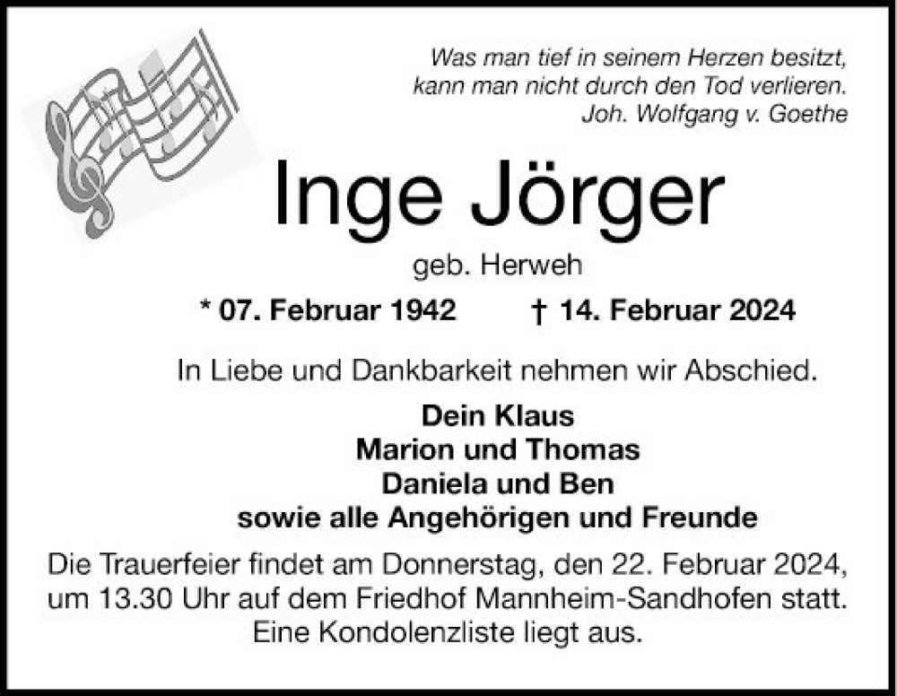 Hier finden Sie alle Traueranzeigen aus der Zeitung, die bisher für Inge Jörger erschienen sind. Weitere Traueranzeigen, die in der Zeitung erscheinen, werden hier ebenfalls aufgelistet
