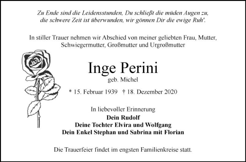 Hier finden Sie alle Traueranzeigen aus der Zeitung, die bisher für Inge Perini erschienen sind. Weitere Traueranzeigen, die in der Zeitung erscheinen, werden hier ebenfalls aufgelistet