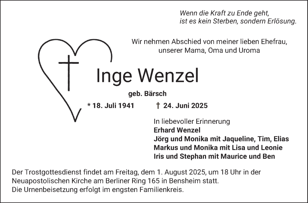 Hier finden Sie alle Traueranzeigen aus der Zeitung, die bisher für Inge Wenzel erschienen sind. Weitere Traueranzeigen, die in der Zeitung erscheinen, werden hier ebenfalls aufgelistet