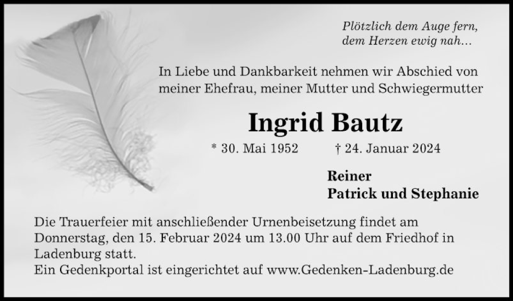Hier finden Sie alle Traueranzeigen aus der Zeitung, die bisher für Ingrid Bautz erschienen sind. Weitere Traueranzeigen, die in der Zeitung erscheinen, werden hier ebenfalls aufgelistet