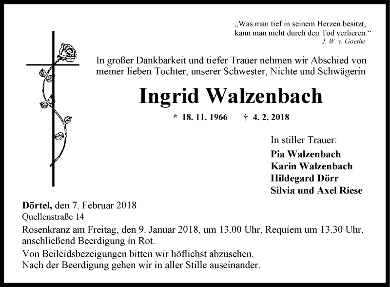 Hier finden Sie alle Traueranzeigen aus der Zeitung, die bisher für Ingrid Walzenbach erschienen sind. Weitere Traueranzeigen, die in der Zeitung erscheinen, werden hier ebenfalls aufgelistet