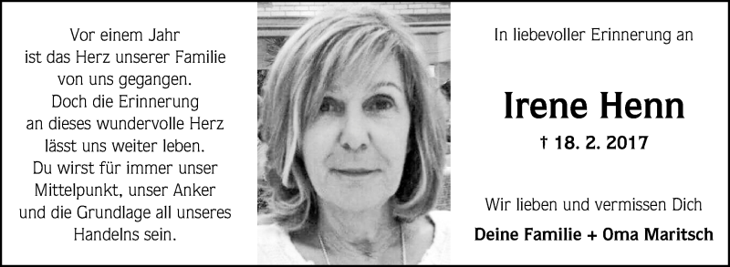 Hier finden Sie alle Traueranzeigen aus der Zeitung, die bisher für Irene Henn erschienen sind. Weitere Traueranzeigen, die in der Zeitung erscheinen, werden hier ebenfalls aufgelistet