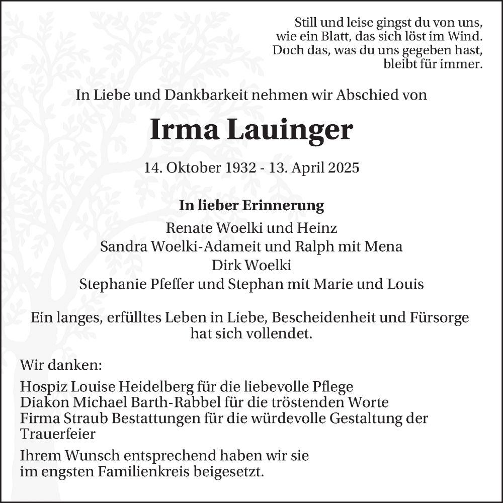 Hier finden Sie alle Traueranzeigen aus der Zeitung, die bisher für Irma Lauinger erschienen sind. Weitere Traueranzeigen, die in der Zeitung erscheinen, werden hier ebenfalls aufgelistet