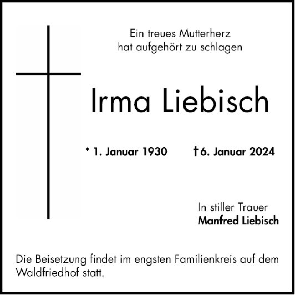 Hier finden Sie alle Traueranzeigen aus der Zeitung, die bisher für Irma Liebisch erschienen sind. Weitere Traueranzeigen, die in der Zeitung erscheinen, werden hier ebenfalls aufgelistet