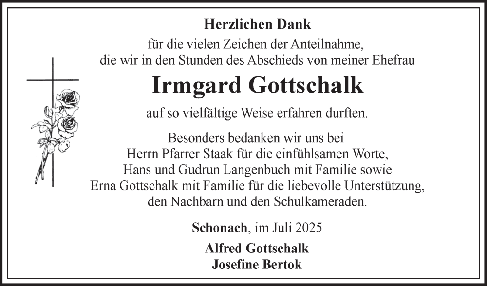 Hier finden Sie alle Traueranzeigen aus der Zeitung, die bisher für Irmgard Gottschalk erschienen sind. Weitere Traueranzeigen, die in der Zeitung erscheinen, werden hier ebenfalls aufgelistet
