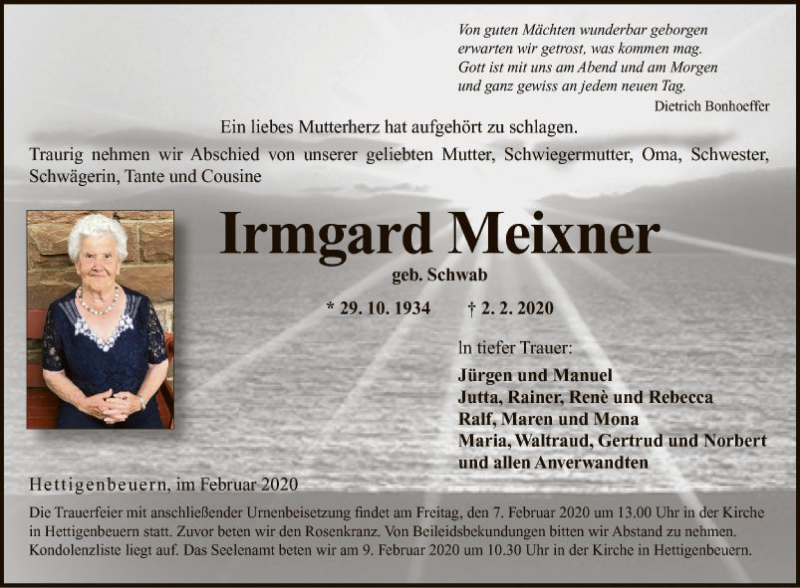 Hier finden Sie alle Traueranzeigen aus der Zeitung, die bisher für Irmgard Meixner erschienen sind. Weitere Traueranzeigen, die in der Zeitung erscheinen, werden hier ebenfalls aufgelistet