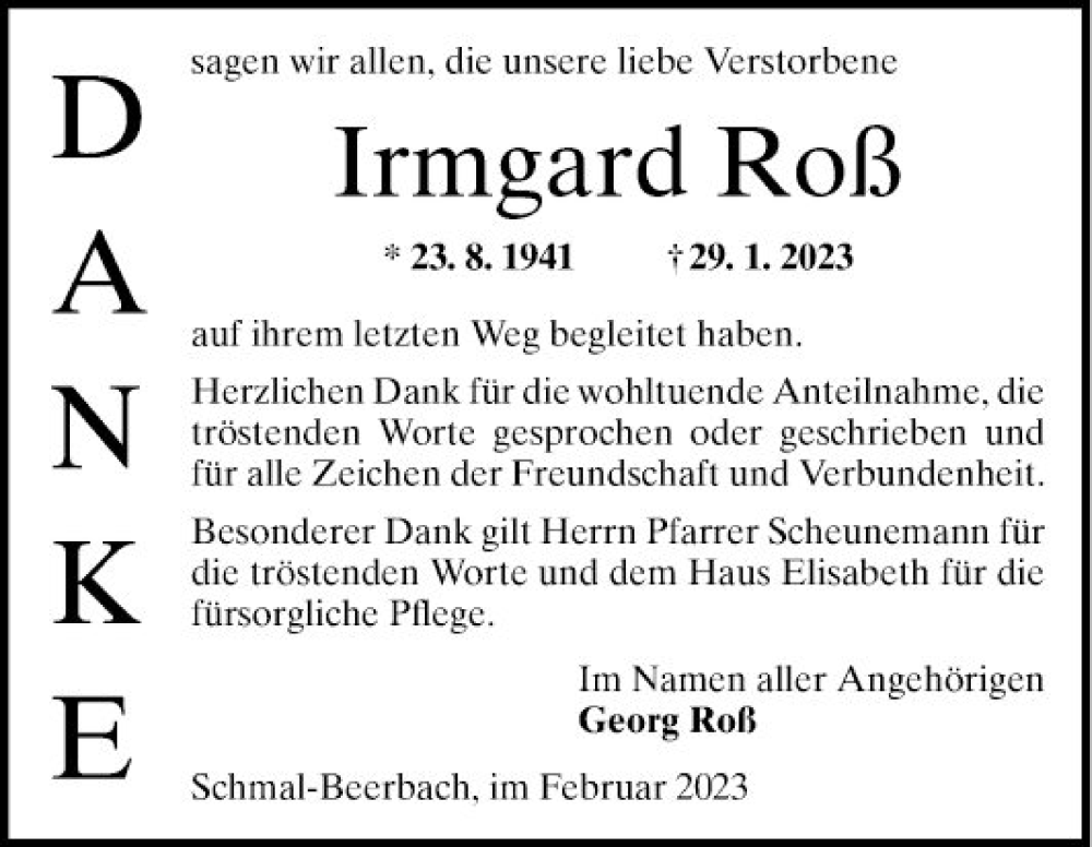 Hier finden Sie alle Traueranzeigen aus der Zeitung, die bisher für Irmgard Roß erschienen sind. Weitere Traueranzeigen, die in der Zeitung erscheinen, werden hier ebenfalls aufgelistet