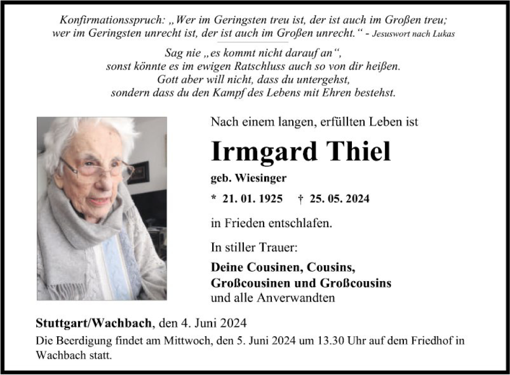 Hier finden Sie alle Traueranzeigen aus der Zeitung, die bisher für Irmgard Thiel erschienen sind. Weitere Traueranzeigen, die in der Zeitung erscheinen, werden hier ebenfalls aufgelistet