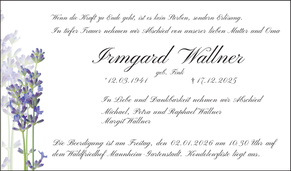 Hier finden Sie alle Traueranzeigen aus der Zeitung, die bisher für Irmgard Wallner erschienen sind. Weitere Traueranzeigen, die in der Zeitung erscheinen, werden hier ebenfalls aufgelistet