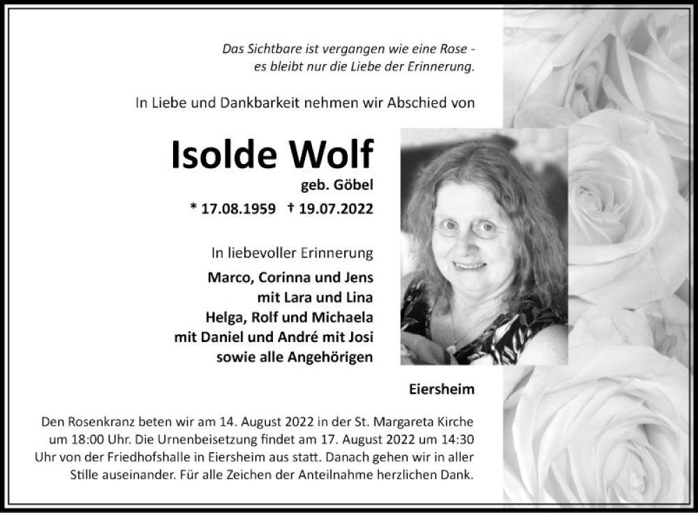 Hier finden Sie alle Traueranzeigen aus der Zeitung, die bisher für Isolde Wolf erschienen sind. Weitere Traueranzeigen, die in der Zeitung erscheinen, werden hier ebenfalls aufgelistet