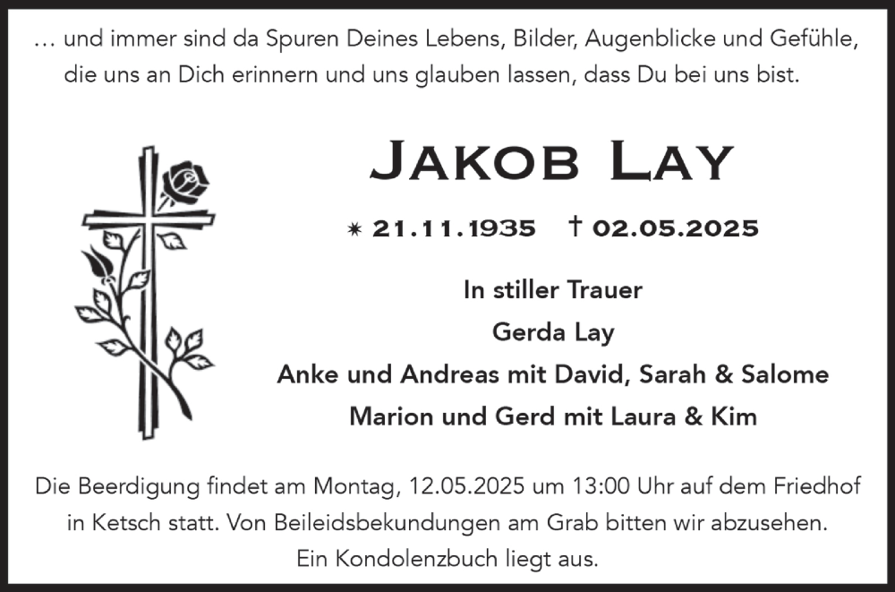 Hier finden Sie alle Traueranzeigen aus der Zeitung, die bisher für Jakob Lay erschienen sind. Weitere Traueranzeigen, die in der Zeitung erscheinen, werden hier ebenfalls aufgelistet