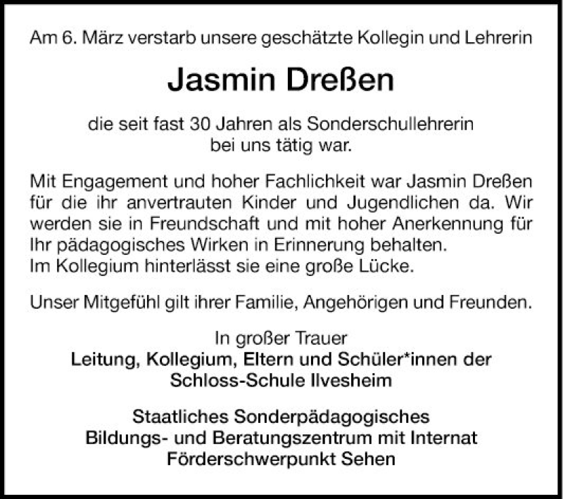 Hier finden Sie alle Traueranzeigen aus der Zeitung, die bisher für Jasmin Dreßen erschienen sind. Weitere Traueranzeigen, die in der Zeitung erscheinen, werden hier ebenfalls aufgelistet