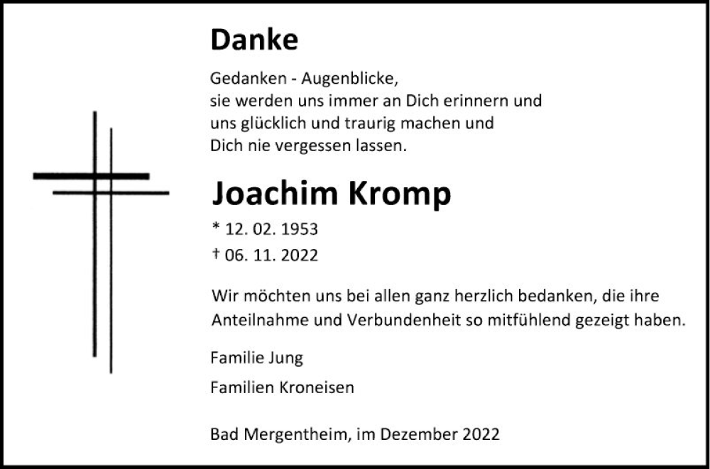 Hier finden Sie alle Traueranzeigen aus der Zeitung, die bisher für Joachim Kromp erschienen sind. Weitere Traueranzeigen, die in der Zeitung erscheinen, werden hier ebenfalls aufgelistet