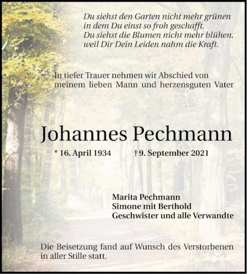 Hier finden Sie alle Traueranzeigen aus der Zeitung, die bisher für Johannes Pechmann erschienen sind. Weitere Traueranzeigen, die in der Zeitung erscheinen, werden hier ebenfalls aufgelistet