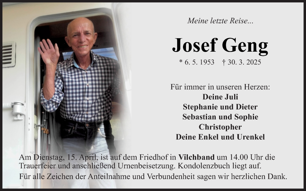 Hier finden Sie alle Traueranzeigen aus der Zeitung, die bisher für Josef Geng erschienen sind. Weitere Traueranzeigen, die in der Zeitung erscheinen, werden hier ebenfalls aufgelistet