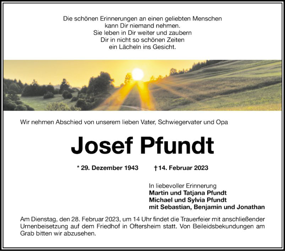 Hier finden Sie alle Traueranzeigen aus der Zeitung, die bisher für Josef Pfundt erschienen sind. Weitere Traueranzeigen, die in der Zeitung erscheinen, werden hier ebenfalls aufgelistet