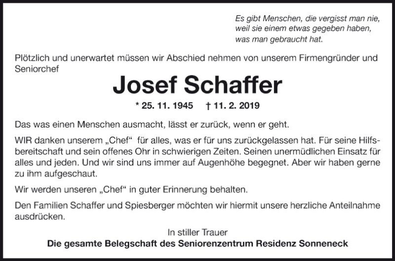 Hier finden Sie alle Traueranzeigen aus der Zeitung, die bisher für Josef Schaffer erschienen sind. Weitere Traueranzeigen, die in der Zeitung erscheinen, werden hier ebenfalls aufgelistet