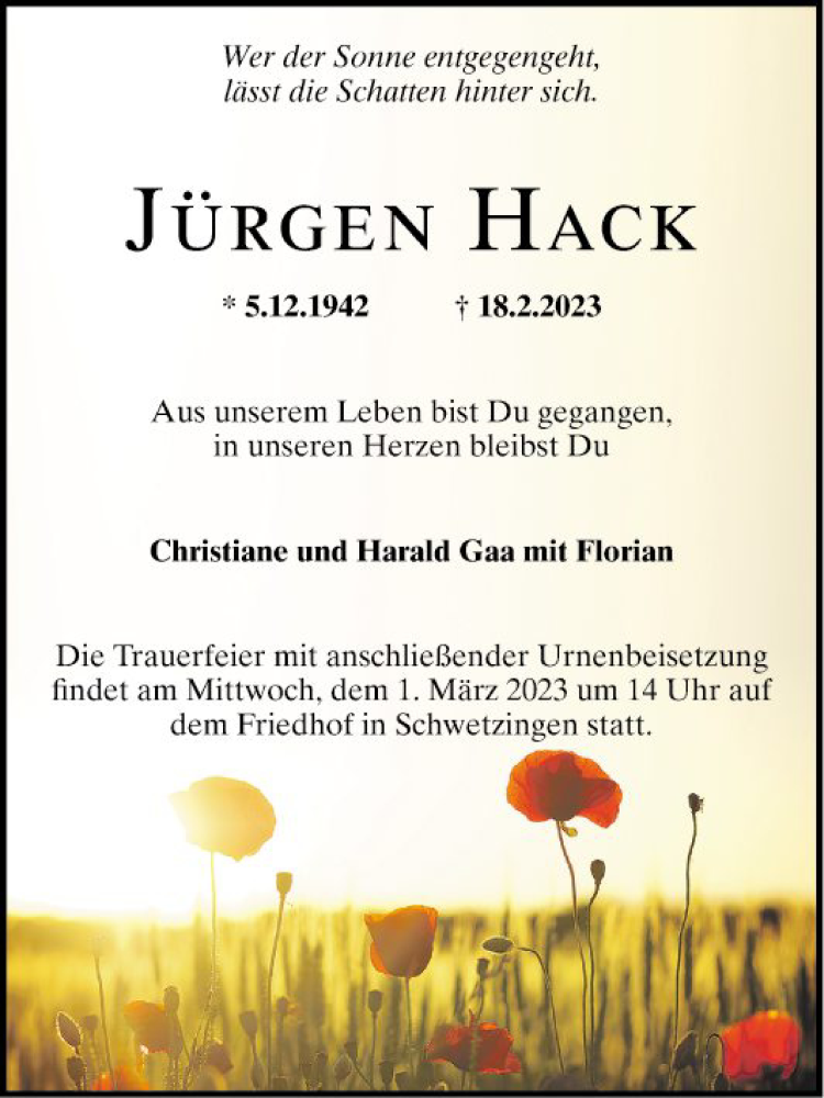 Hier finden Sie alle Traueranzeigen aus der Zeitung, die bisher für Jürgen Hack erschienen sind. Weitere Traueranzeigen, die in der Zeitung erscheinen, werden hier ebenfalls aufgelistet
