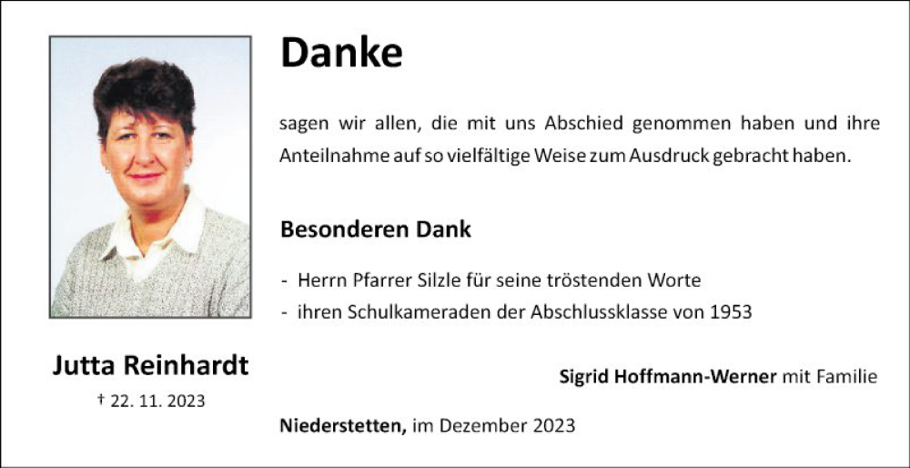 Hier finden Sie alle Traueranzeigen aus der Zeitung, die bisher für Jutta Reinhardt erschienen sind. Weitere Traueranzeigen, die in der Zeitung erscheinen, werden hier ebenfalls aufgelistet