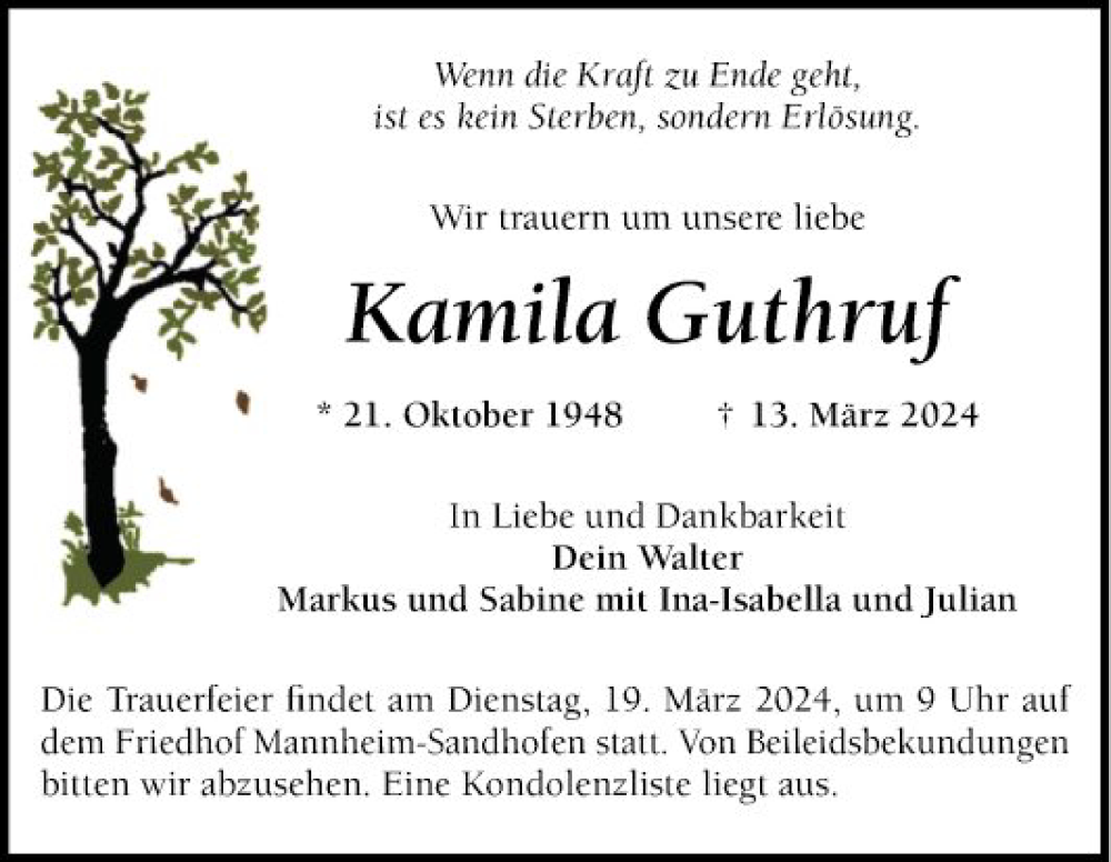 Hier finden Sie alle Traueranzeigen aus der Zeitung, die bisher für Kamila Guthruf erschienen sind. Weitere Traueranzeigen, die in der Zeitung erscheinen, werden hier ebenfalls aufgelistet