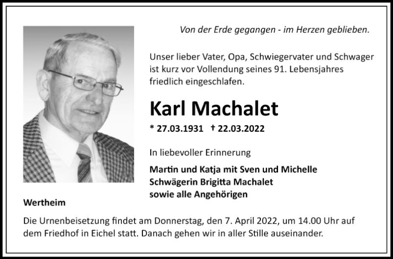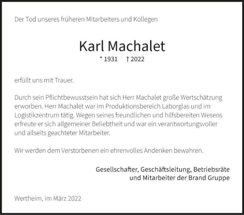 Hier finden Sie alle Traueranzeigen aus der Zeitung, die bisher für Karl Machalet erschienen sind. Weitere Traueranzeigen, die in der Zeitung erscheinen, werden hier ebenfalls aufgelistet