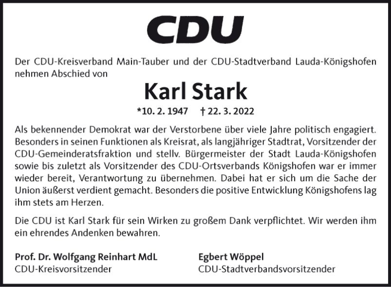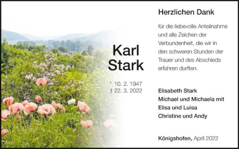 Hier finden Sie alle Traueranzeigen aus der Zeitung, die bisher für Karl Stark erschienen sind. Weitere Traueranzeigen, die in der Zeitung erscheinen, werden hier ebenfalls aufgelistet