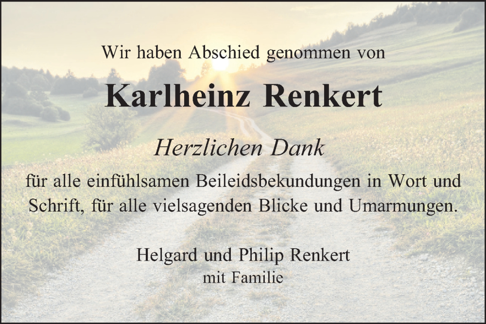 Hier finden Sie alle Traueranzeigen aus der Zeitung, die bisher für Karlheinz Renkert erschienen sind. Weitere Traueranzeigen, die in der Zeitung erscheinen, werden hier ebenfalls aufgelistet