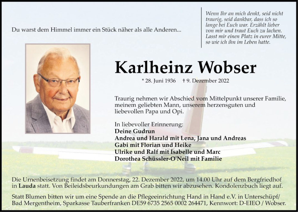 Hier finden Sie alle Traueranzeigen aus der Zeitung, die bisher für Karlheinz Wobser erschienen sind. Weitere Traueranzeigen, die in der Zeitung erscheinen, werden hier ebenfalls aufgelistet