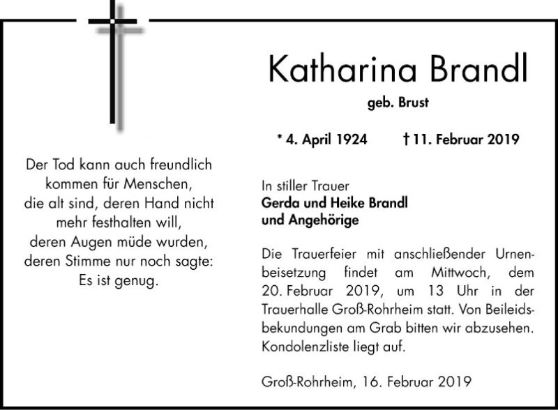 Hier finden Sie alle Traueranzeigen aus der Zeitung, die bisher für Katharina Brandl erschienen sind. Weitere Traueranzeigen, die in der Zeitung erscheinen, werden hier ebenfalls aufgelistet