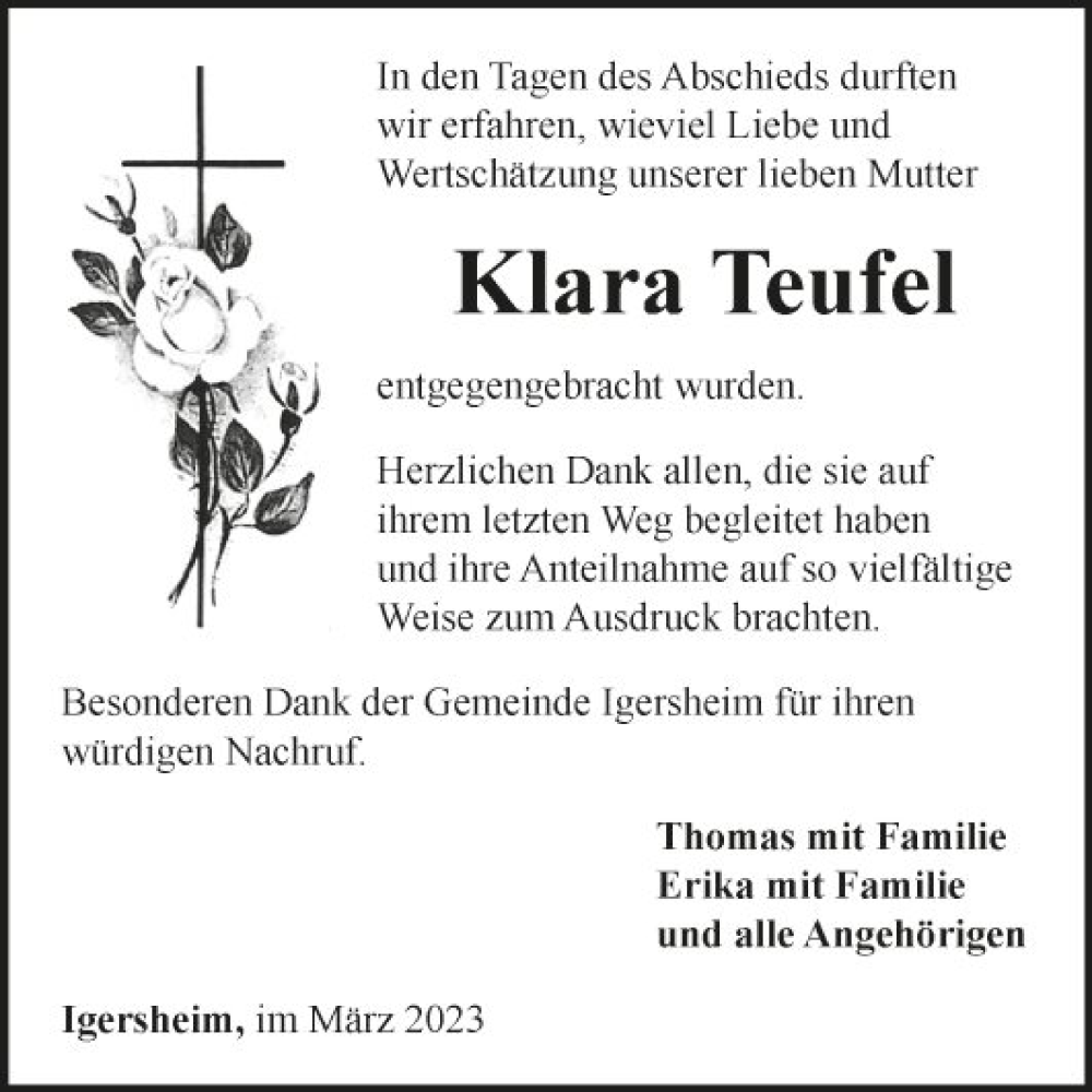 Hier finden Sie alle Traueranzeigen aus der Zeitung, die bisher für Klara Teufel erschienen sind. Weitere Traueranzeigen, die in der Zeitung erscheinen, werden hier ebenfalls aufgelistet