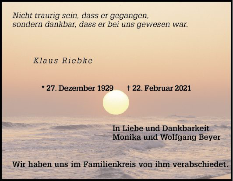 Hier finden Sie alle Traueranzeigen aus der Zeitung, die bisher für Klaus Rlebke erschienen sind. Weitere Traueranzeigen, die in der Zeitung erscheinen, werden hier ebenfalls aufgelistet