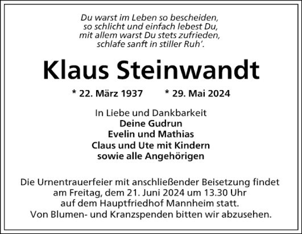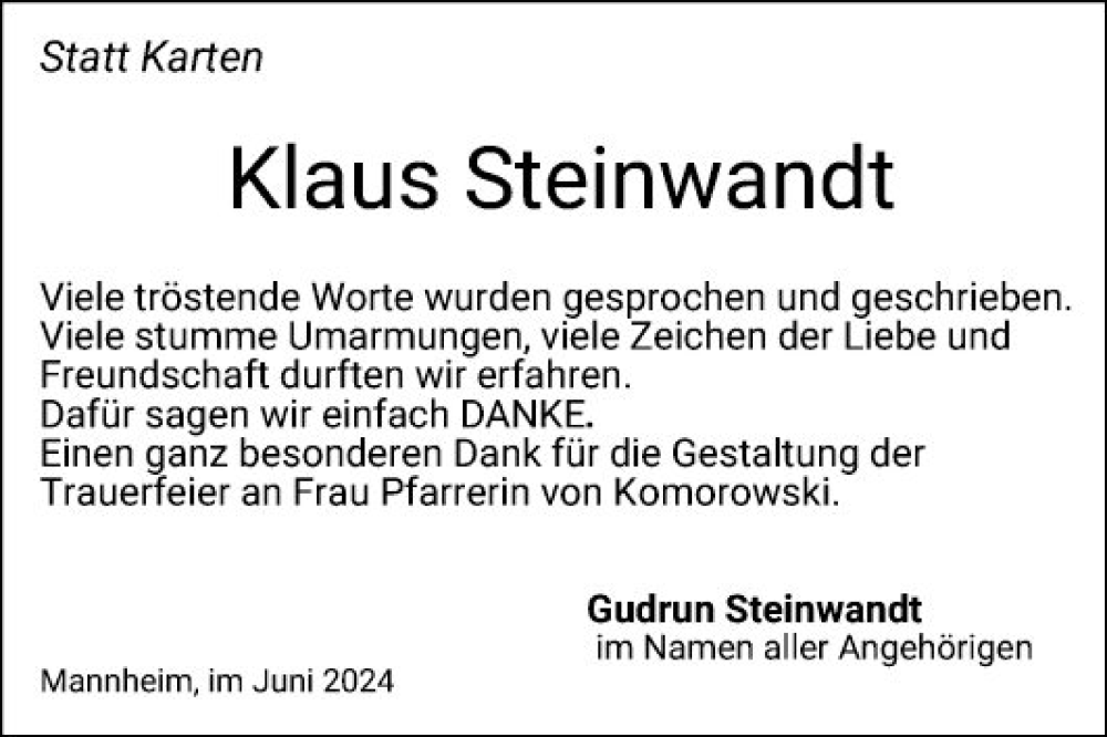Hier finden Sie alle Traueranzeigen aus der Zeitung, die bisher für Klaus Steinwandt erschienen sind. Weitere Traueranzeigen, die in der Zeitung erscheinen, werden hier ebenfalls aufgelistet