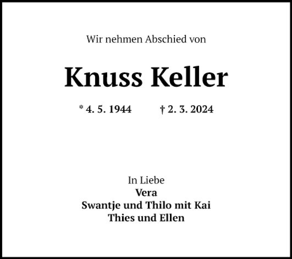 Hier finden Sie alle Traueranzeigen aus der Zeitung, die bisher für Knuss Keller erschienen sind. Weitere Traueranzeigen, die in der Zeitung erscheinen, werden hier ebenfalls aufgelistet