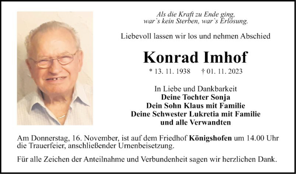 Hier finden Sie alle Traueranzeigen aus der Zeitung, die bisher für Konrad Imhof erschienen sind. Weitere Traueranzeigen, die in der Zeitung erscheinen, werden hier ebenfalls aufgelistet