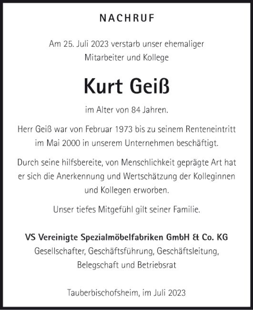 Hier finden Sie alle Traueranzeigen aus der Zeitung, die bisher für Kurt Geiß erschienen sind. Weitere Traueranzeigen, die in der Zeitung erscheinen, werden hier ebenfalls aufgelistet