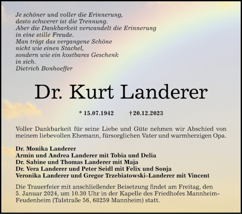 Hier finden Sie alle Traueranzeigen aus der Zeitung, die bisher für Kurt Landerer erschienen sind. Weitere Traueranzeigen, die in der Zeitung erscheinen, werden hier ebenfalls aufgelistet